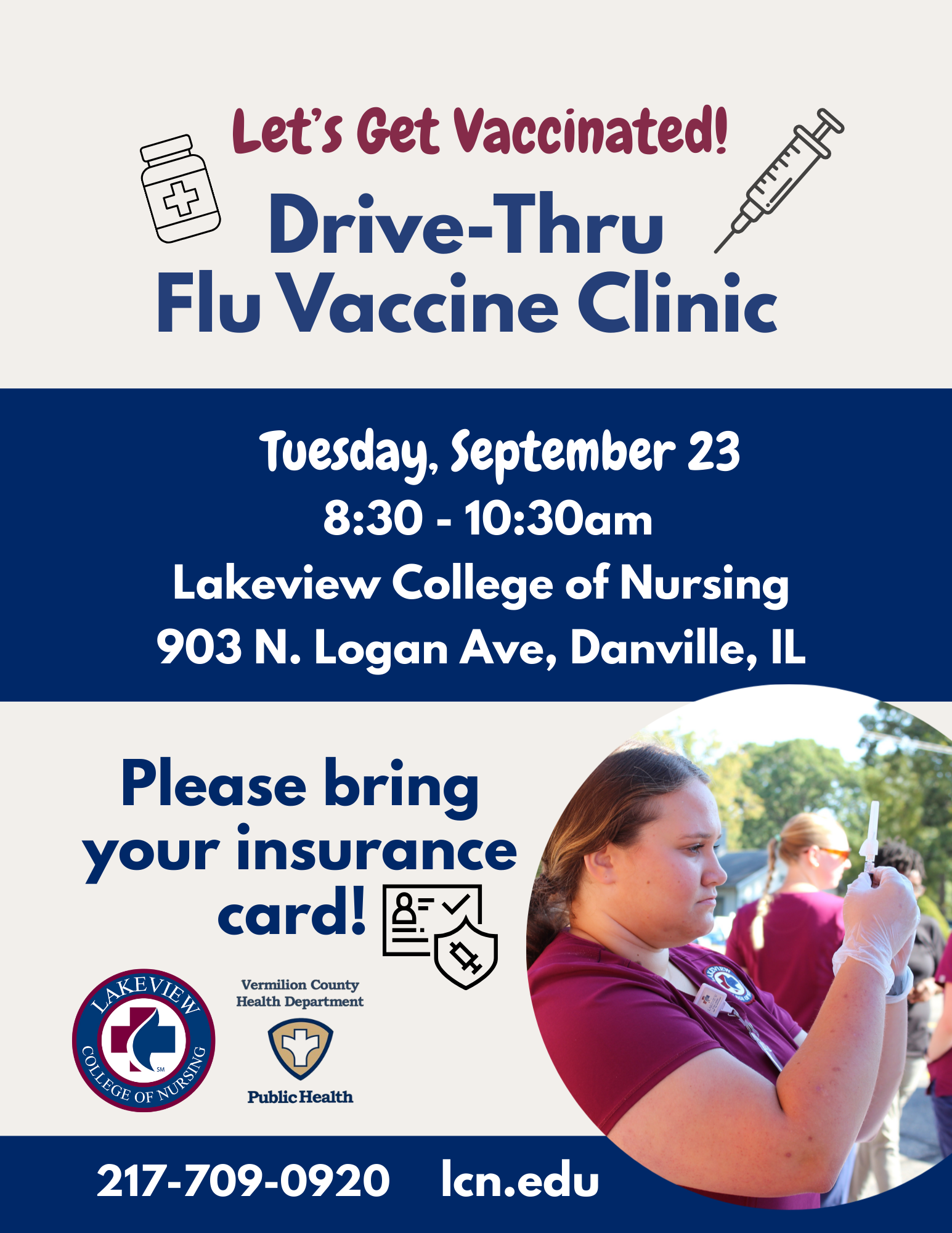Danville, IL (09/15/2025) — Lakeview College of Nursing, in partnership with the Vermilion County Health Department, will host a Drive-Thru Flu Clinic on Tuesday, September 23, 2025, from 8:30 to 10:30 a.m.